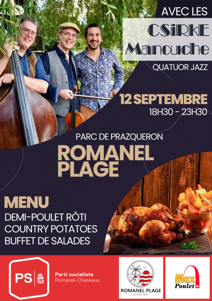 Quatuor de jazz manouche, dont notre ami Daniel Spörri à la basse, de manière intermittente de 19h30 jusqu’à la fin. Au chapeau !